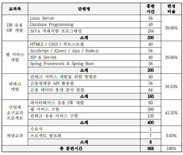 본 과정에서는 핀테크 서비스 개발 실현을 위하여 백엔드 및 프론트엔드를 함께 학습하여 기술개발역량을 강화하는데 중점을 두고 있습니다. 또한 타 기관 대비 압도적인 프로젝트 중점 과정으로 실질적이고 확실한 결과를 얻어가실 수 있습니다.