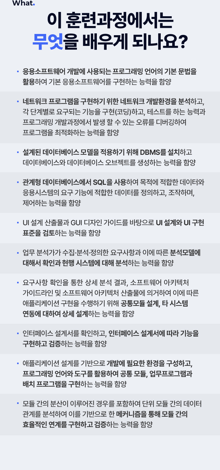 애플리케이션 설계를 기반으로 개발에 필요한 환경을 구성하고, 프로그래밍 언어와 도구를 활용하여 공통 모듈, 업무 프로그램과 배치 프로그램을 구현하는 능력을 함양