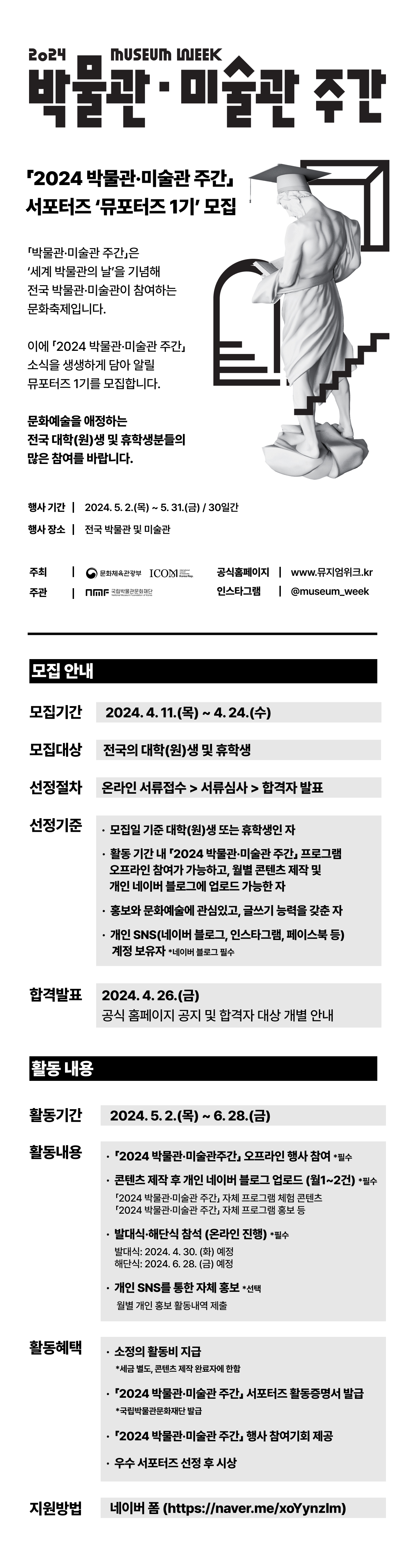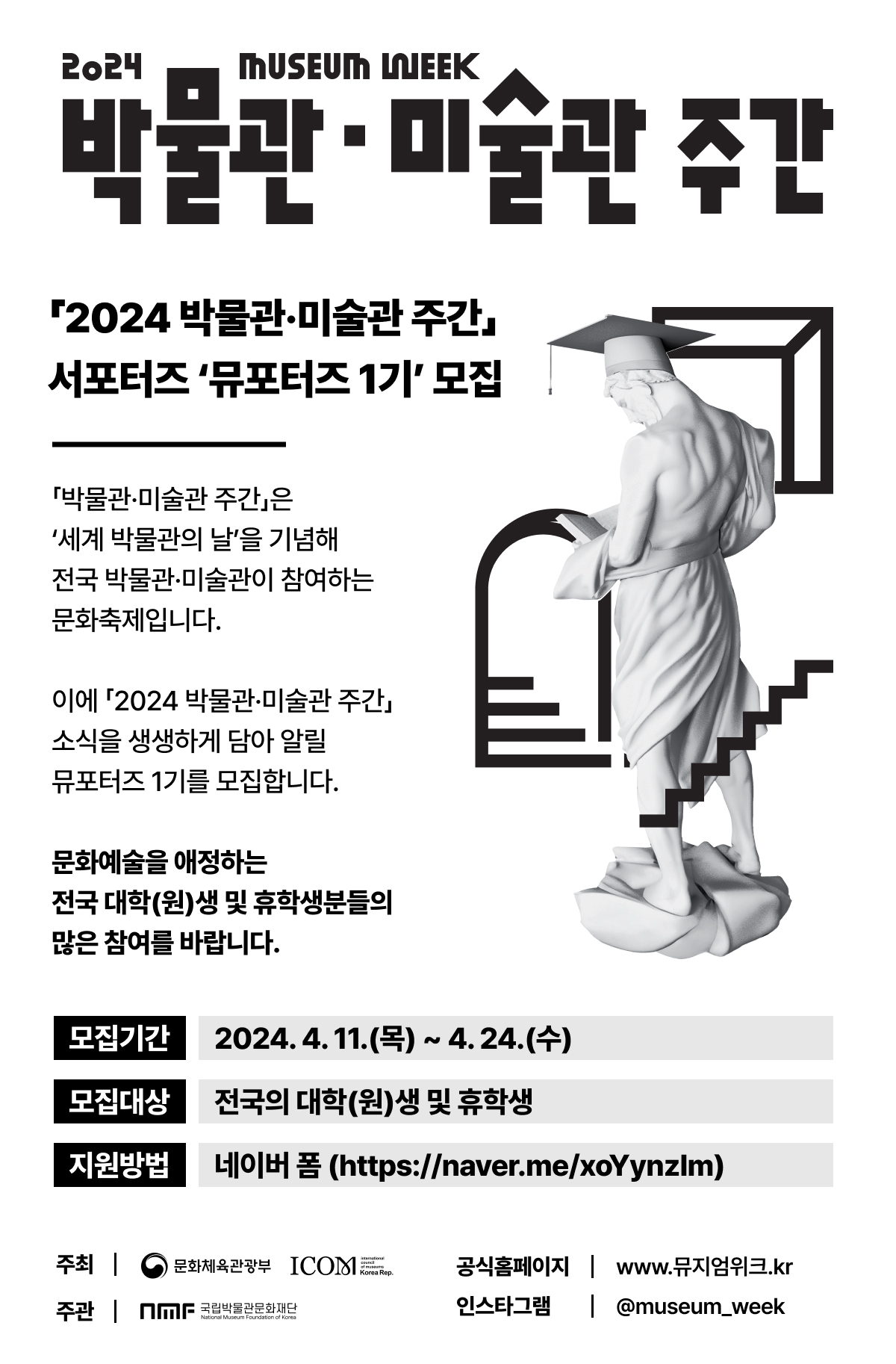「박물관·미술관 주간」은 ‘세계 박물관의 날’을 기념해 전국 박물관·미술관이 참여하는 문화축제입니다. 이에 「2024 박물관·미술관 주간」 소식을 생생하게 담아 알릴 뮤포터즈 1기를 모집합니다. 문화예술을 애정하는 전국 대학(원)생 및 휴학생분들의 많은 참여를 바랍니다.