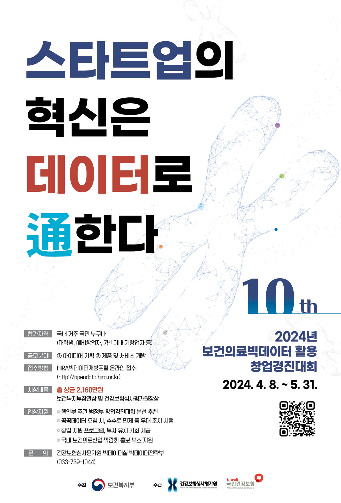 데이터 경제 활성화를 선도할 창의적인 보건의료빅데이터 기반 비즈니스 모델과 스타트업을 발굴하여 창업 생태계 조성과 성장을 지원하고, 공공데이터 활용을 촉진하기 위해 「2024년 보건의료빅데이터 활용 창업경진대회」를 개최하오니 많은 관심과 참여 바랍니다.