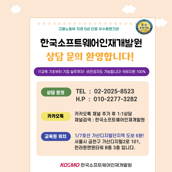 - 카카오톡 : 채널 검색[한국소프트웨어인재개발원]추가 1:1상담요청