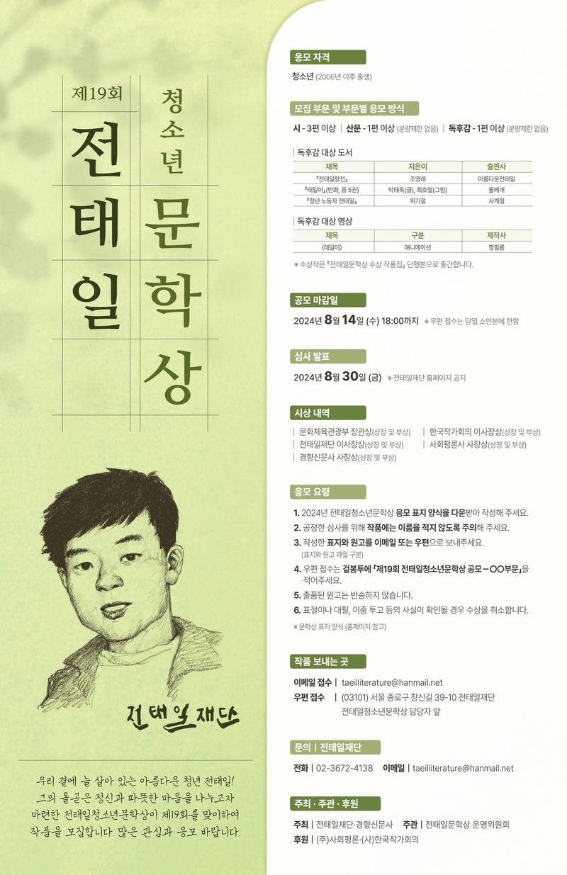 그의 올곧은 정신과 따뜻한 마음을 나누고자 마련한 전태일청소년문학상이 제19회를 맞이하여 작품을 모집합니다. 많은 관심과 응모 바랍니다.