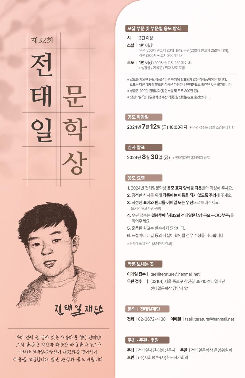 4. 우편 접수는 겉봉투에 「제32회 전태일문학상 공모-○○부문」을 적어주세요.