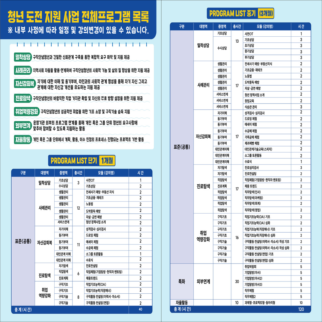 맞춤형 교육 프로그램 지원, 미취업 청년의 사회활동 참여 의욕 고취를 위한 소규모 멘토링, 1:多 특강 등 청년에게 적합한 모듈형 교육 제공