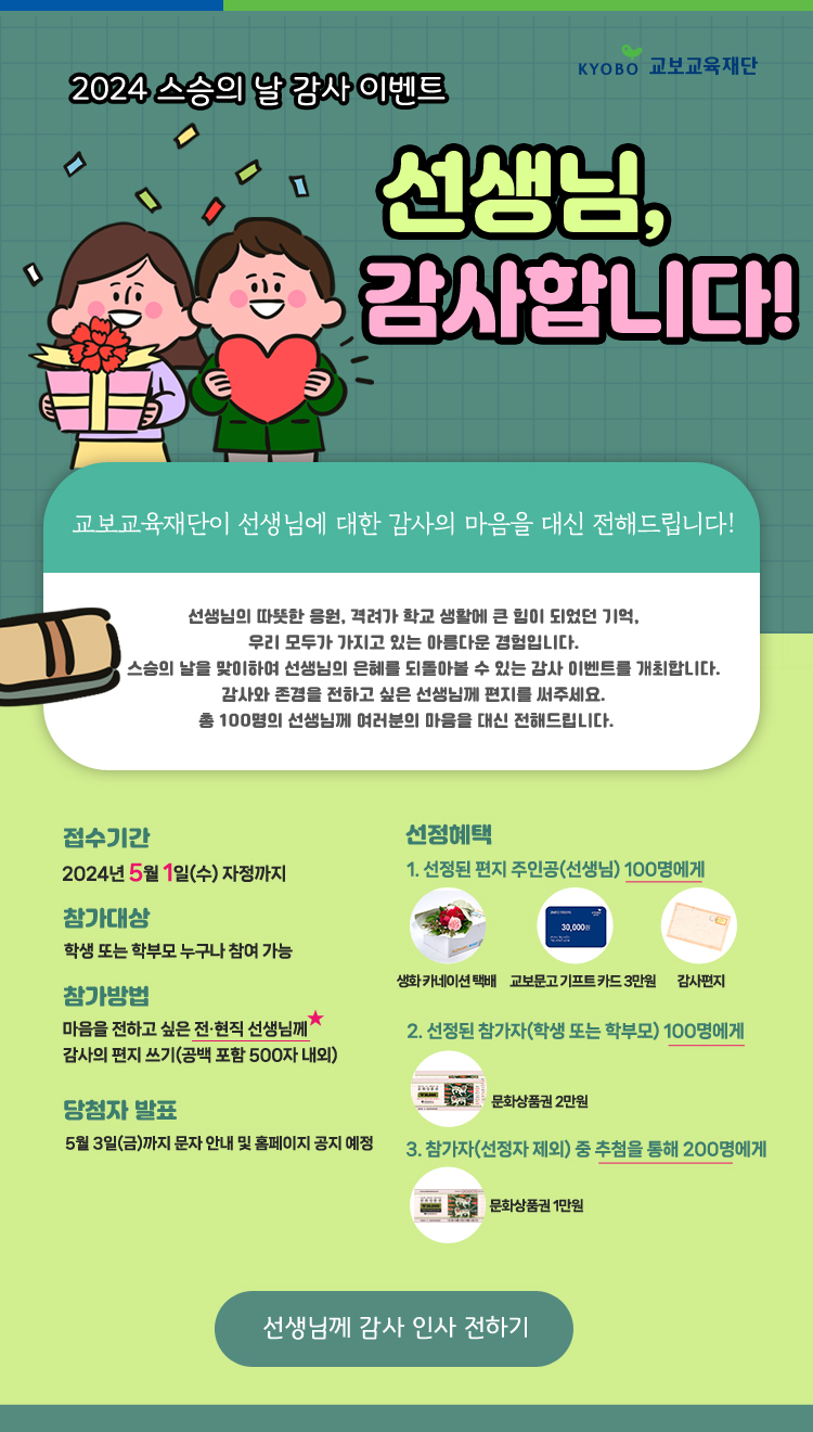 - 이벤트명 : 2024 스승의 날 감사 이벤트 <선생님, 감사합니다!>