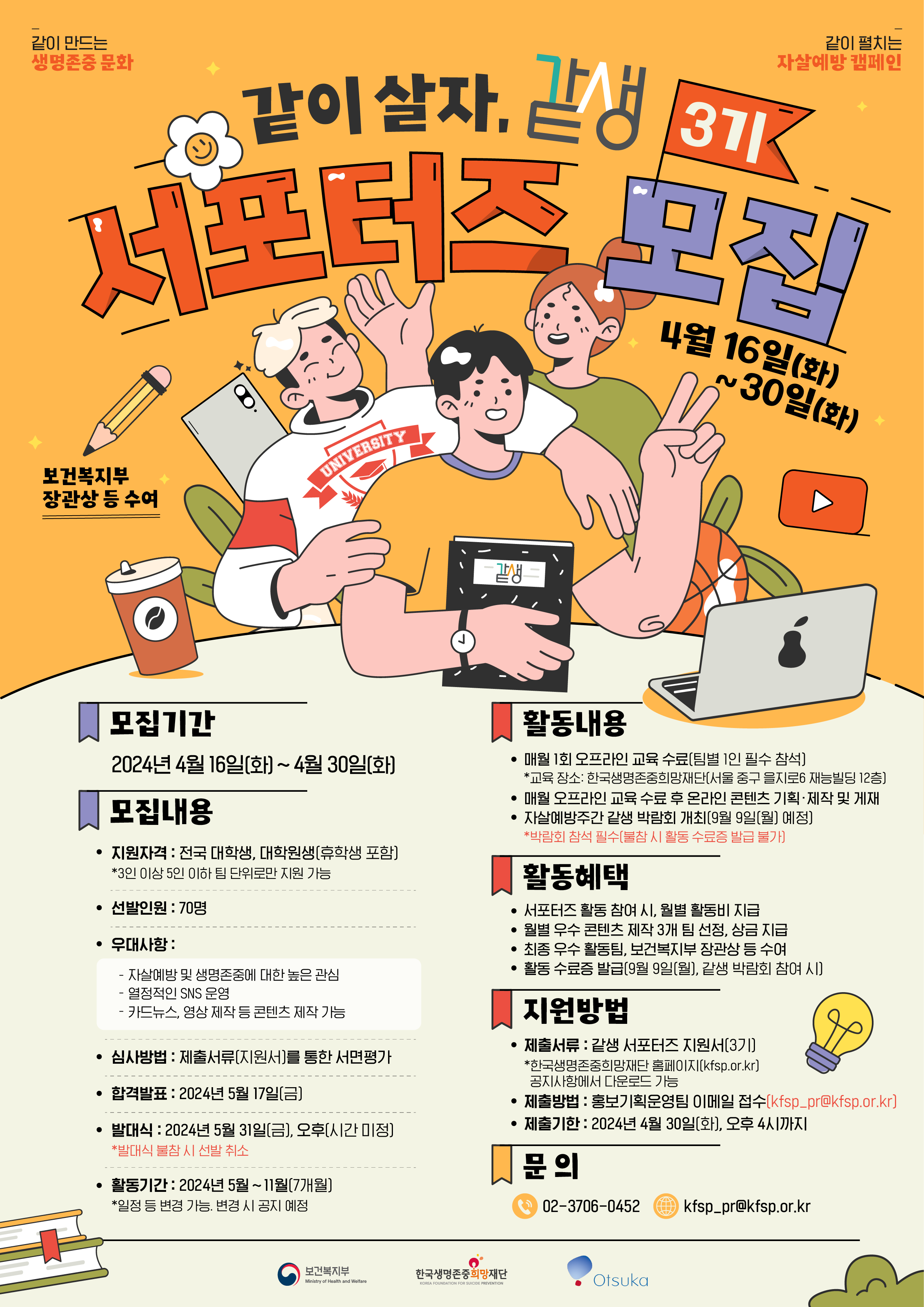 한국생명존중희망재단에서 자살예방 및 생명존중 인식개선 프로젝트에 함께할 같생 서포터즈 3기를 모집합니다.