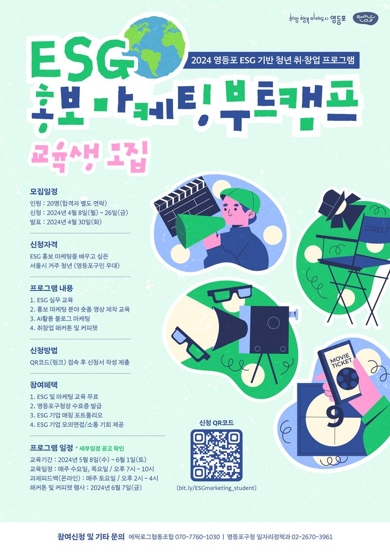 - 참여자혜택 : ESG 및 마케팅 교육 무료, 영등포구청장 수료증 발급, ESG 기업 매칭 포트폴리오, ESG기업 모의면접/소통 기회 제공