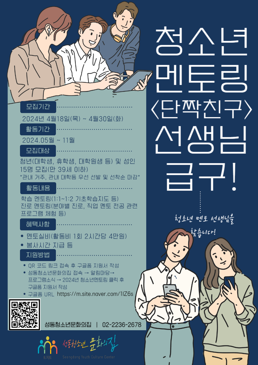 📢 성동청소년문화의집에서는 청소년멘토링 사업 <단짝친구>와 함께 할 멘토 선생님을 모집합니다!