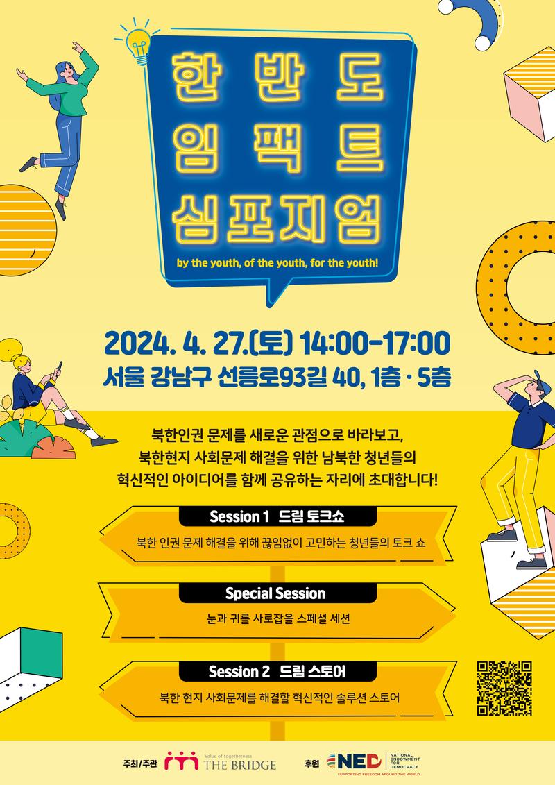 더 브릿지와 NED(전미민주주의기금)가 함께하는 한반도 임팩트 메이커스 2기가 성황리에 마무리 되었습니다🎉 활동을 통해 도출된 다양한 북한현지 사회문제와 남북한 청년들의 솔루션을 보다 많은 분들과 함께 공유하고자 심포지엄을 개최 합니다 :)