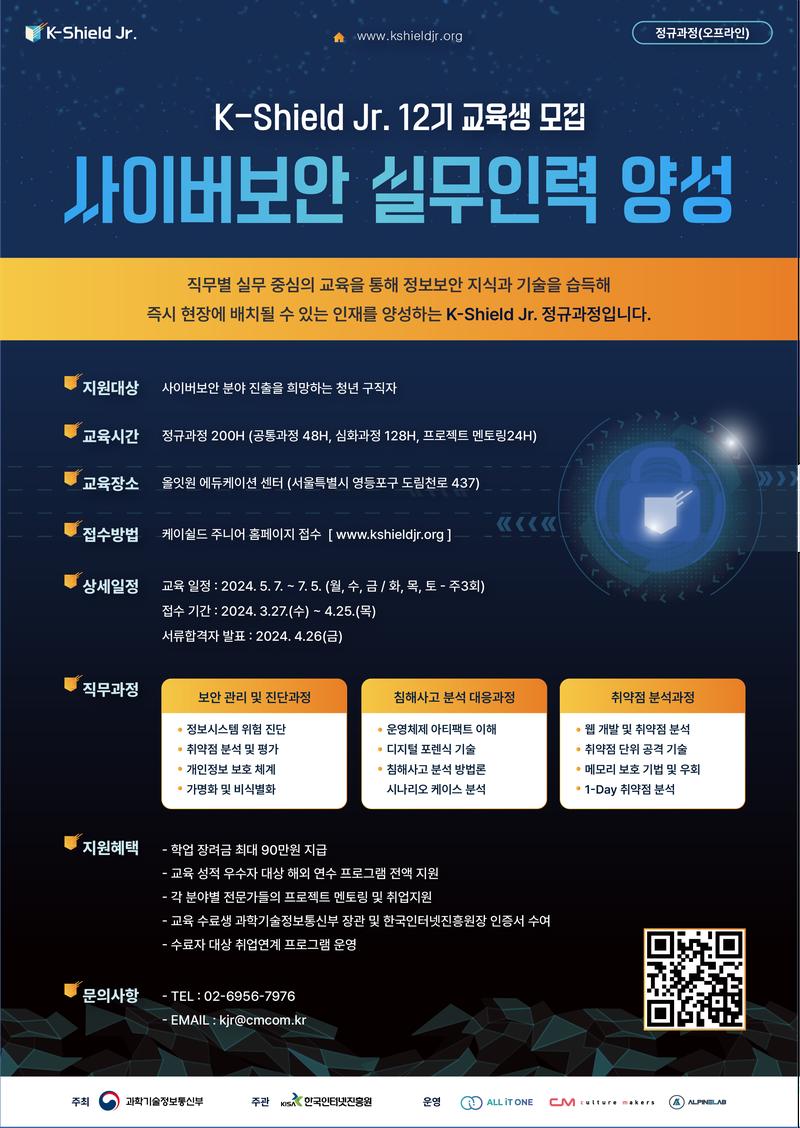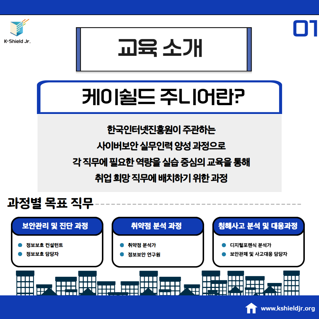 - K-Shield Jr. 사이버보안 인력양성은 바로 현장에 투입될 수 있도록 국내 보안 기업이 직접 요구하는지식과 기술을 집중적으로 다루며 각 과정에 맞는 교육 수료후 협력 업체와 연계해 취업을 지원하는한국인터넷진흥원이 주관하는 국내 최고의 교육과정입니다.