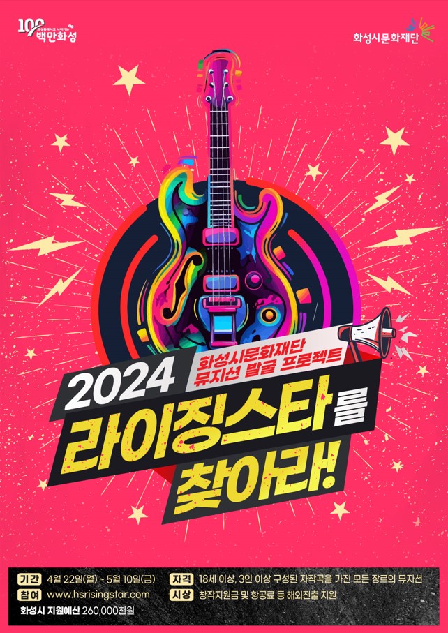 의무사항 | ▪ 현장경연 1~5위 대상 국내 쇼케이스 2회 ▪ 현장경연 진출 뮤지션 중 교류 아트마켓 사무국 초청 1팀 해외 쇼케이스 ▪ 2024년 화성시문화재단 월간지 <화분> 인터뷰 1회 ▪ 2025 라이징스타를 찾아라 경연 축하공연 ▪ 1~5위 뮤지션 화성시 연계활동 연중 1회 |