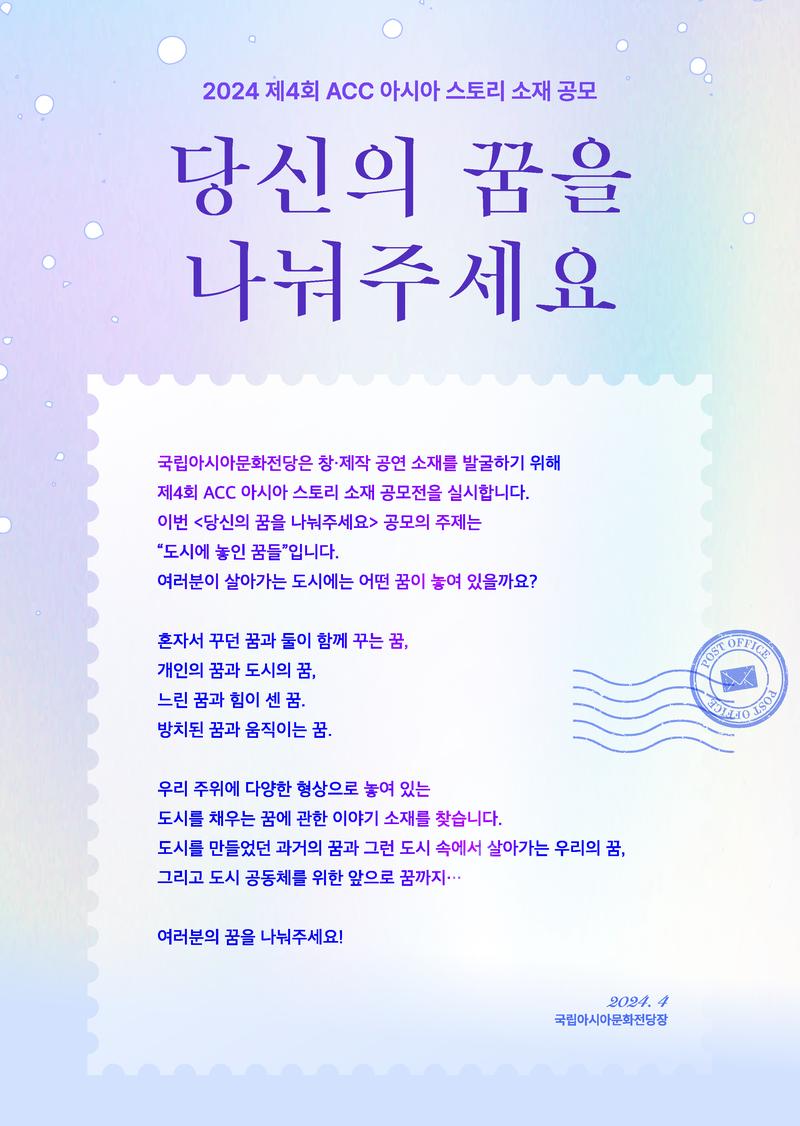- 저작권을 포함한 응모작에 대한 모든 권리는 기본적으로 응모자에게 귀속되나, 수상작에 대한 공연화 권리 및 이를 포함한 2차적저작물작성권에 대하여는 국립아시아문화전당에 이용허락을 한 것으로 간주합니다.