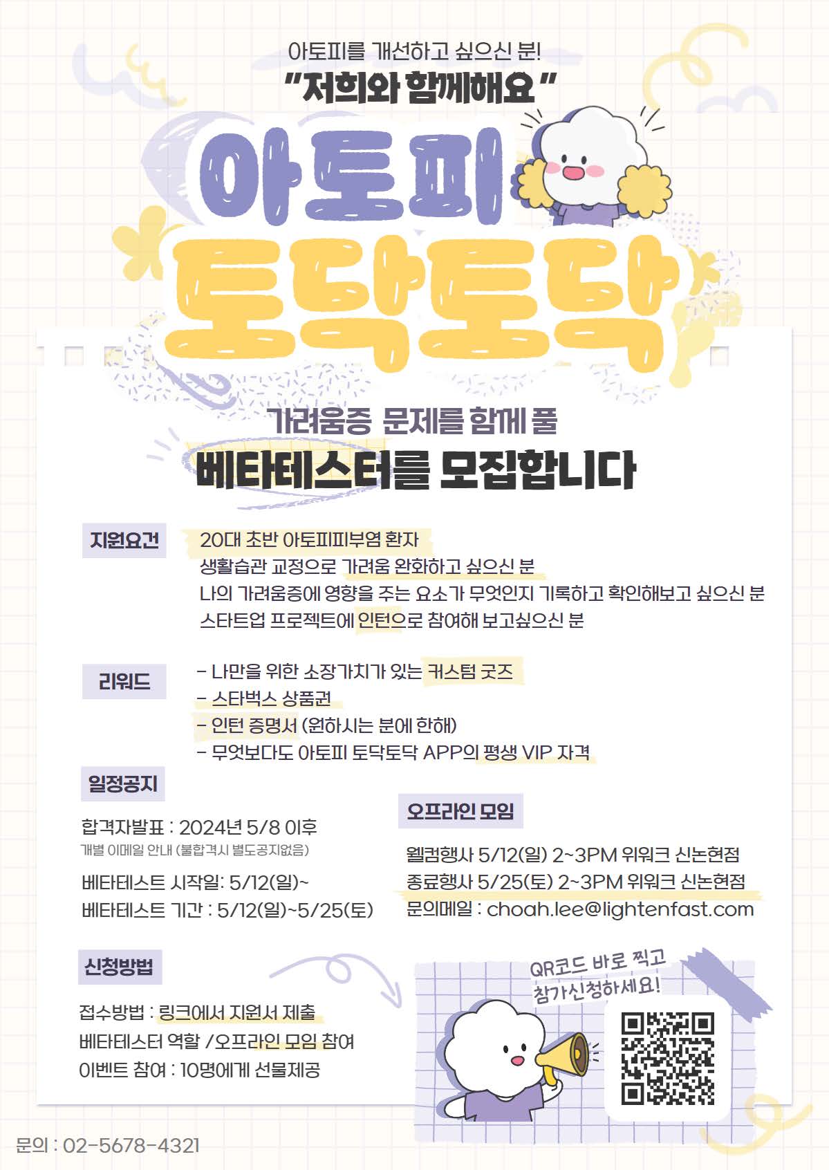 아토피 토닥토닥이 아토피 피부염 유저들에게 가치있는 APP이 될 수 있도록 평가와 조언을 해주실 분들을 손꼽아 기다리고 있습니다. 아래 요건에 해당되시는 분들의 많은 참여 부탁드립니다.