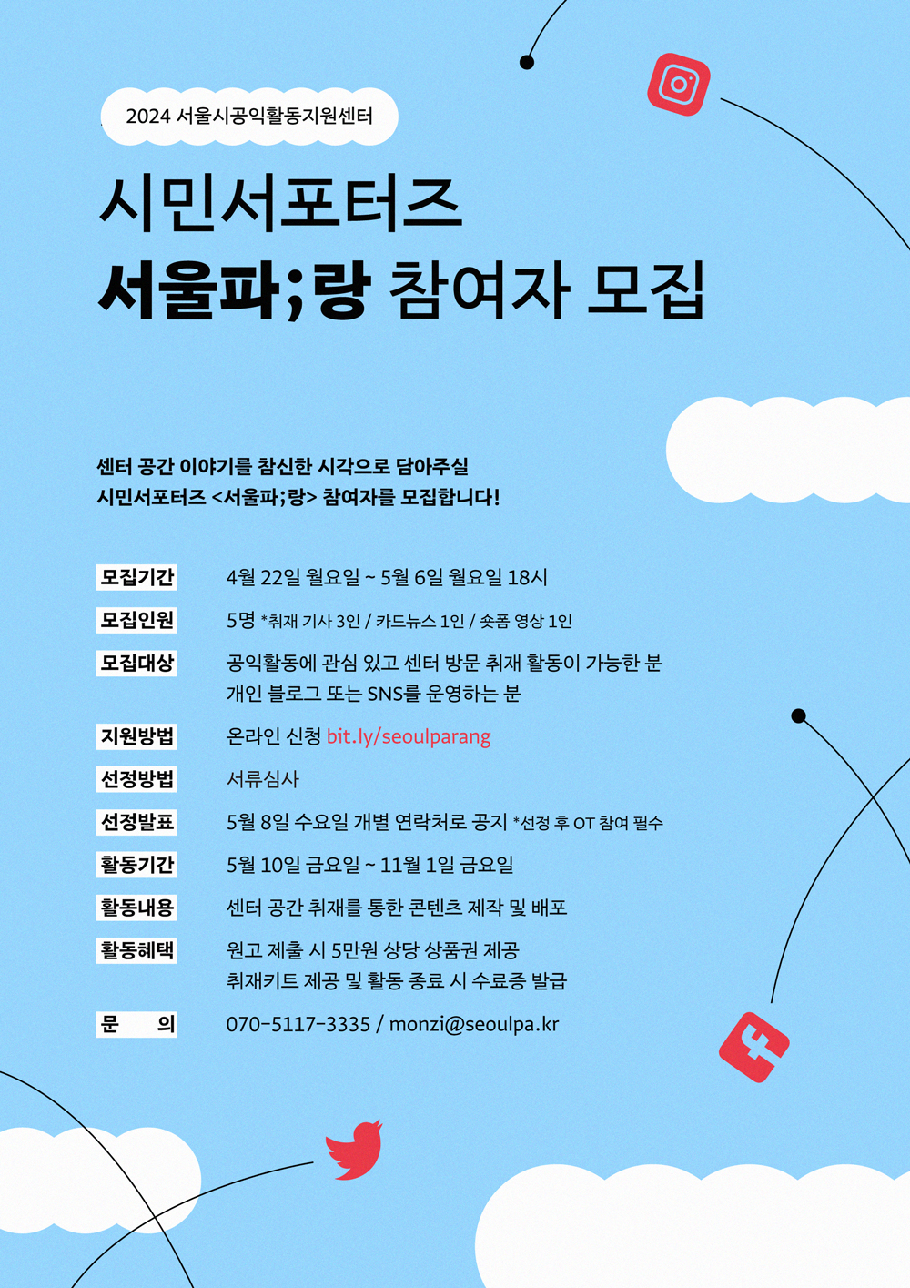 🍀문의 : 서포터즈 운영 담당 070-5117-3335 / monzi@seoulpa.kr (평일 9:00~18:00)