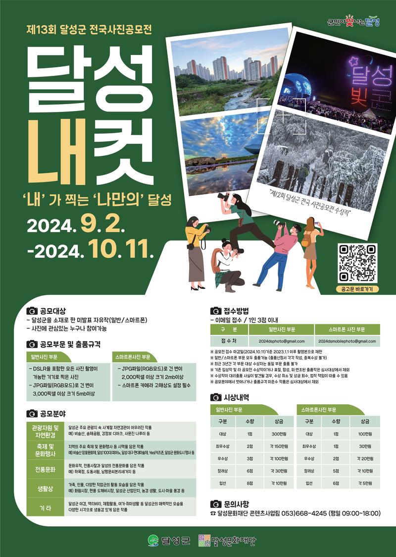 (재)달성문화재단에서는 달성군의 자연환경, 관광지, 축제 등 문화콘텐츠와 일상생활 속 숨겨진 달성의 다채로운 모습들을 다양한 시각으로 표현한 사진 콘텐츠를 확보하여 대내외적으로 홍보하고자 "제13회 달성군 전국 사진공모전"을 개최하오니 많은 관심과 참여 바랍니다.