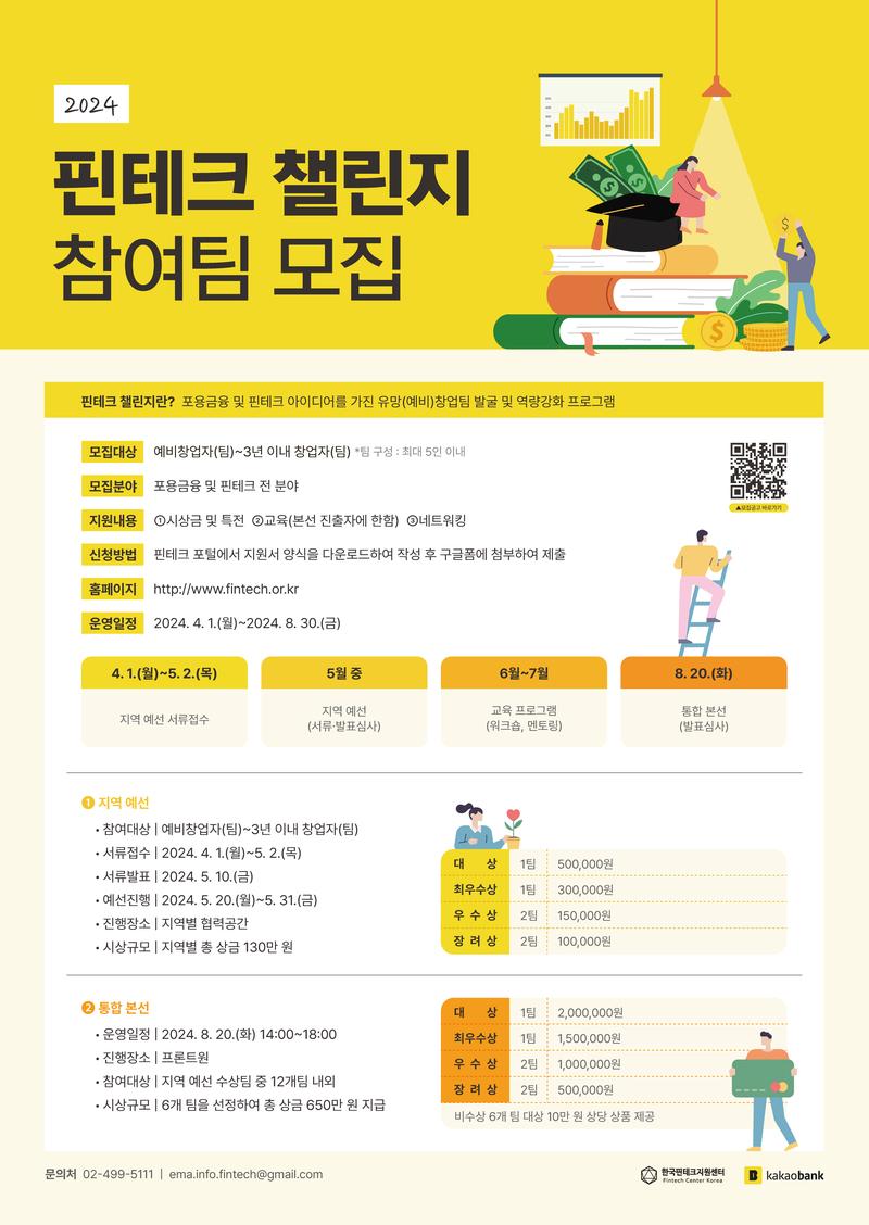- 카카오뱅크 후원, 한국핀테크지원센터 주최, MYSC에서 운영하는 금융사회 안전망 구축 사업-핀테크 챌린지에서 포용금융&핀테크 창업 아이디어를 가진 (예비)창업팀을 발굴하고 지원합니다.