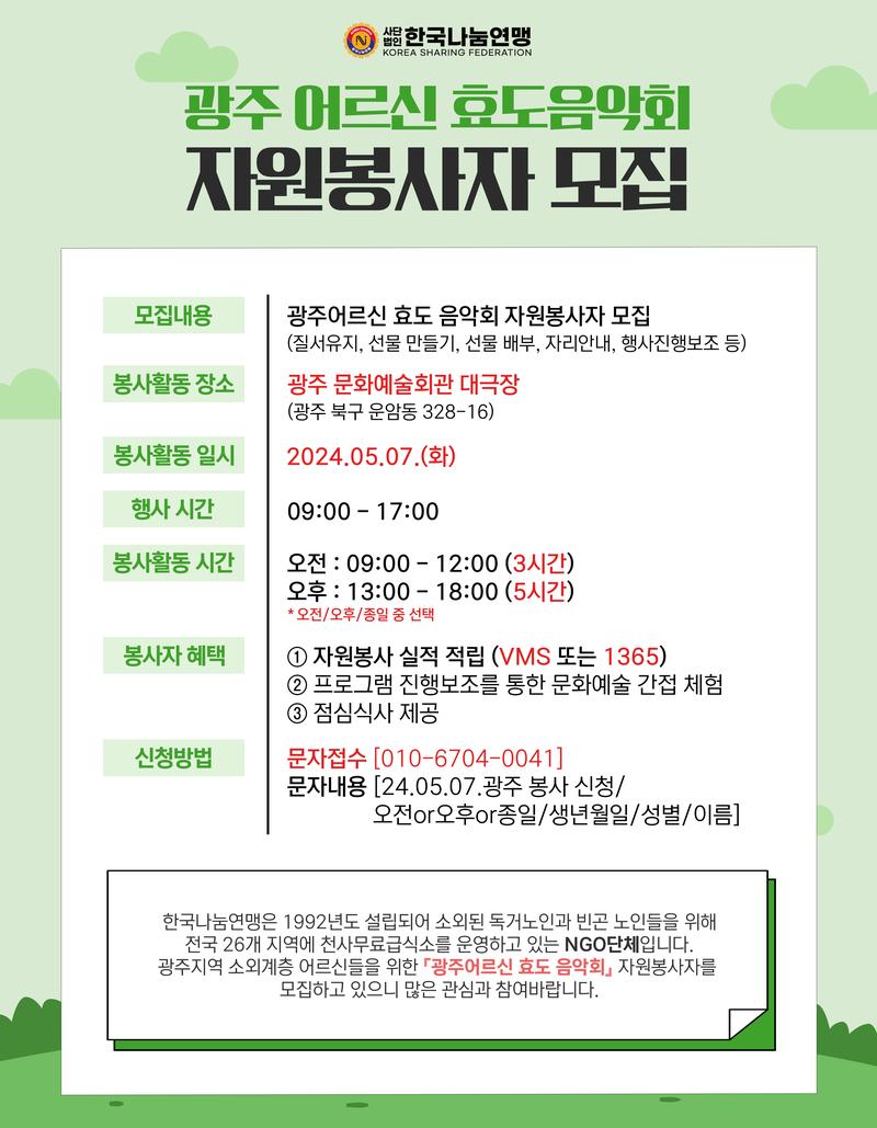 문자 내용 : 광주 자원봉사 신청 / 오전or오후or종일 / 생년월일 / 성별 / 성함