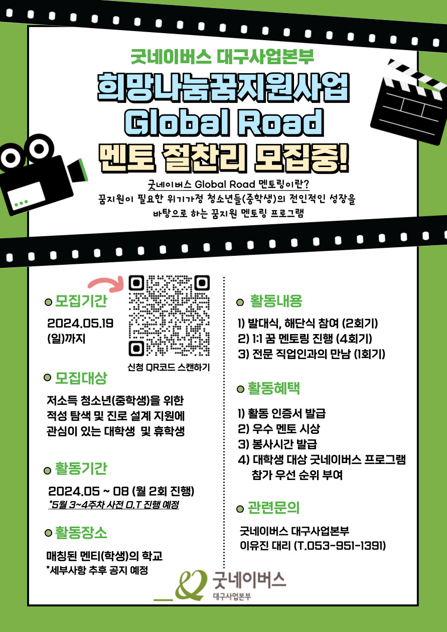 꿈지원이 필요한 위기가정 청소년들(중학생)의 전인적인 성장을 바탕으로 하는 꿈지원 멘토링 프로그램인 2024년 굿네이버스 희망나눔꿈지원사업 'Global Road' 멘토를 절.찬.리. 모집중입니다 !!!!!!!!!!!!!!