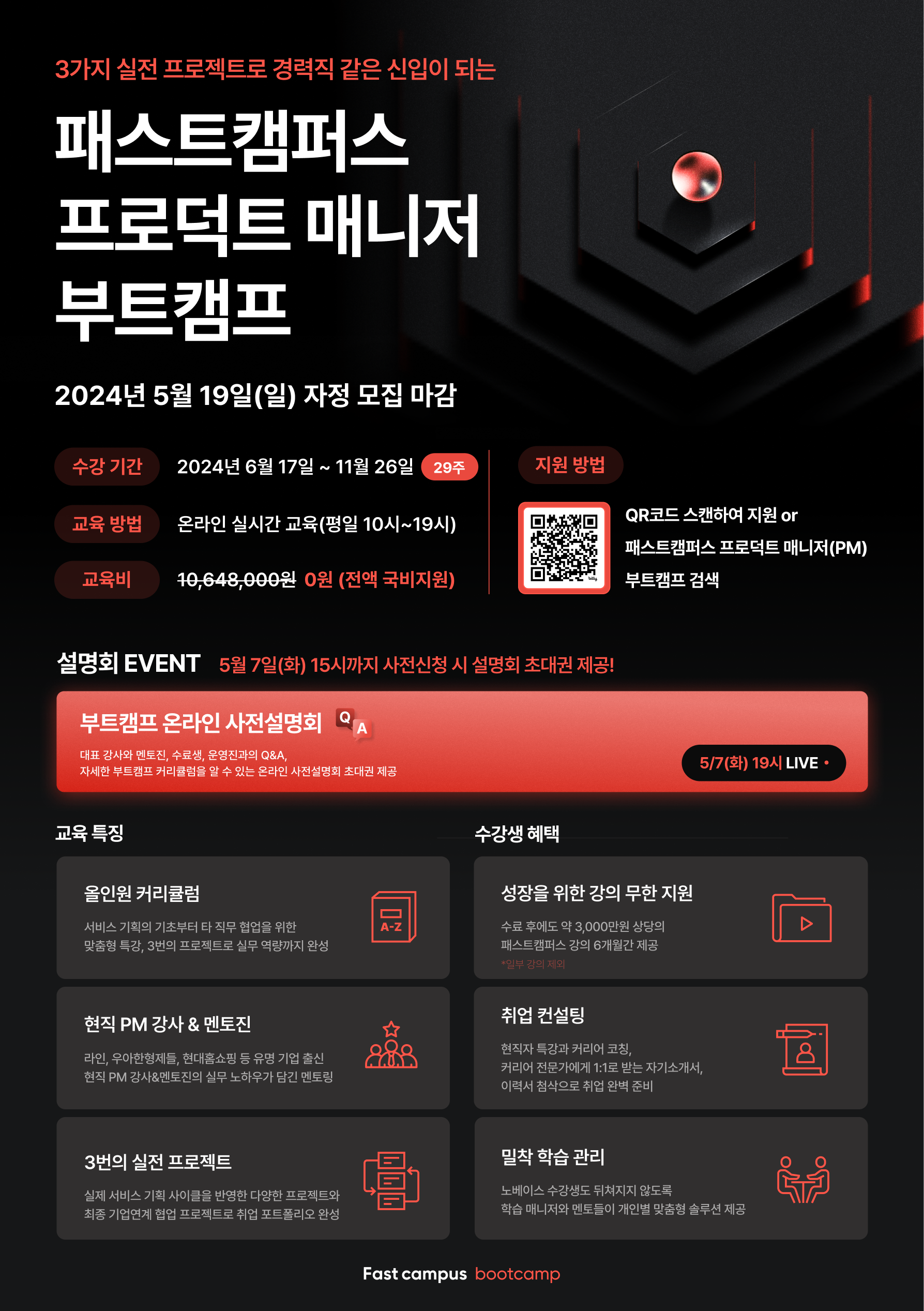 - 수료시 3천만원 상당의 패스트캠퍼스 온라인 강의 6개월간 무제한 수강🎁