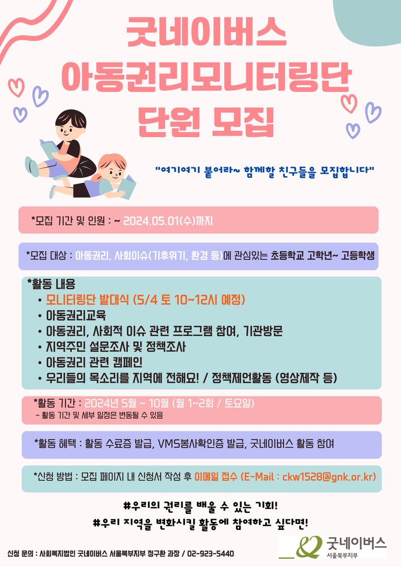 [사회복지법인 굿네이버스 서울북부지부 2024년도 아동권리모니터링단 단원 모집]