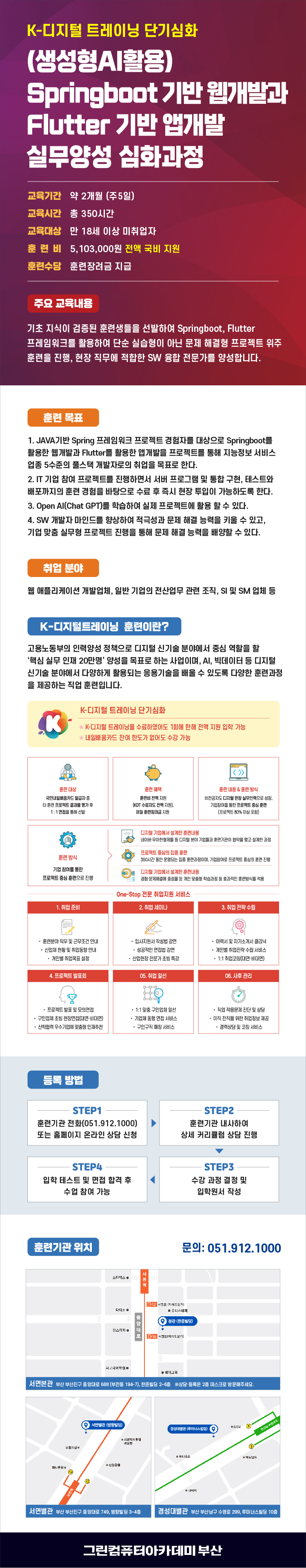 ■ 과정명 : [K디지털트레이닝 단기심화] (생성형AI활용)Springboot 기반 웹개발과 Flutter 기반 앱개발 실무양성 심화과정