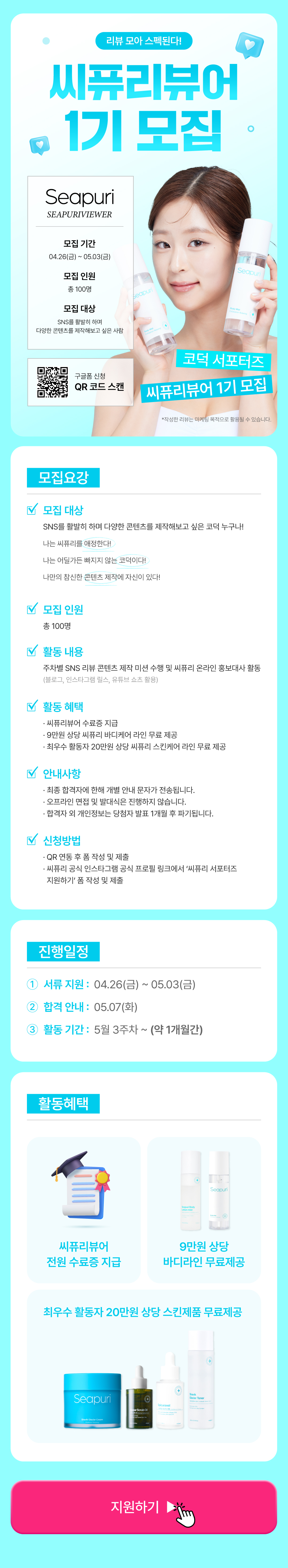 최우수 활동자 20만원 상당 씨퓨리 스킨케어 라인 무료 제공