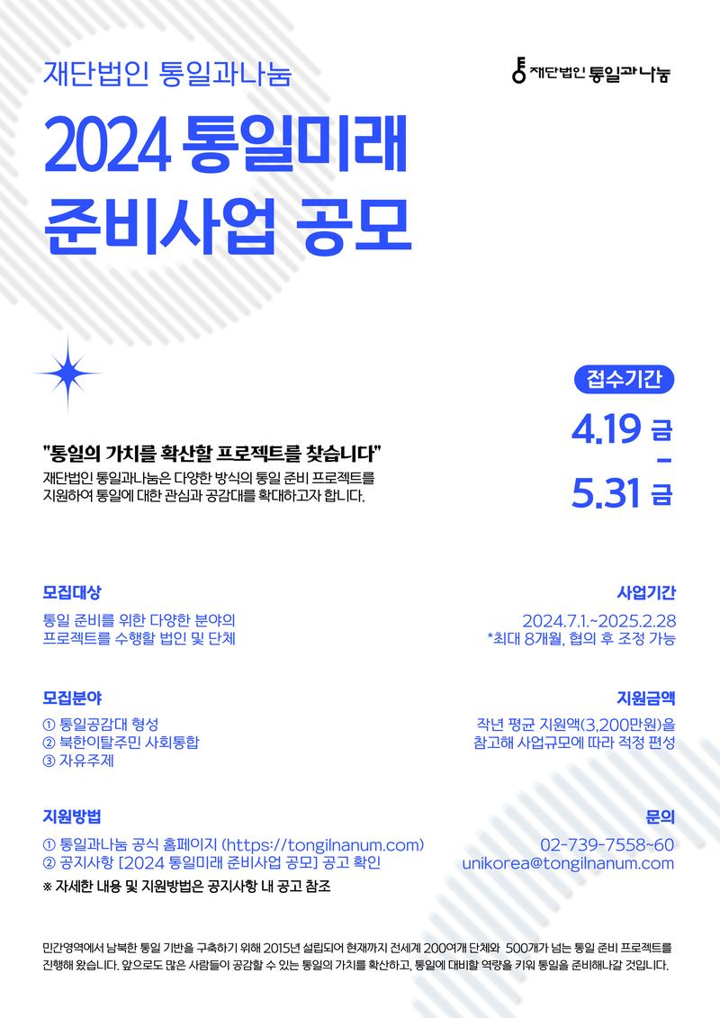 통일의 미래를 준비하기 위해 ‘2024 통일미래 준비사업’을 다음과 같이 실시합니다.