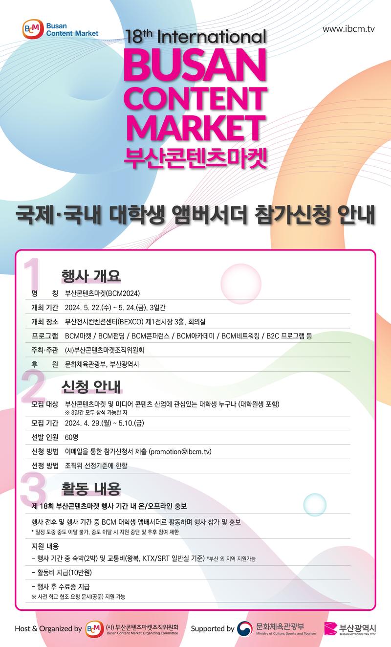 제18회 부산콘텐츠마켓 (BCM2024) 국제·국내 대학생 앰버서더를 모집합니다!