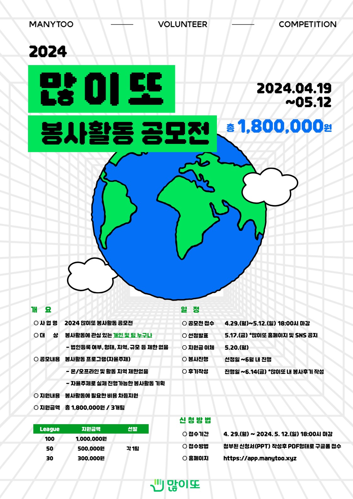 내가 하고 싶은, 내가 만드는, 다양하고 재밌는 봉사 활동이 생겨나길 바라며 「많이또 봉사활동 공모전」을 시작합니다!!! 🎉🌟
