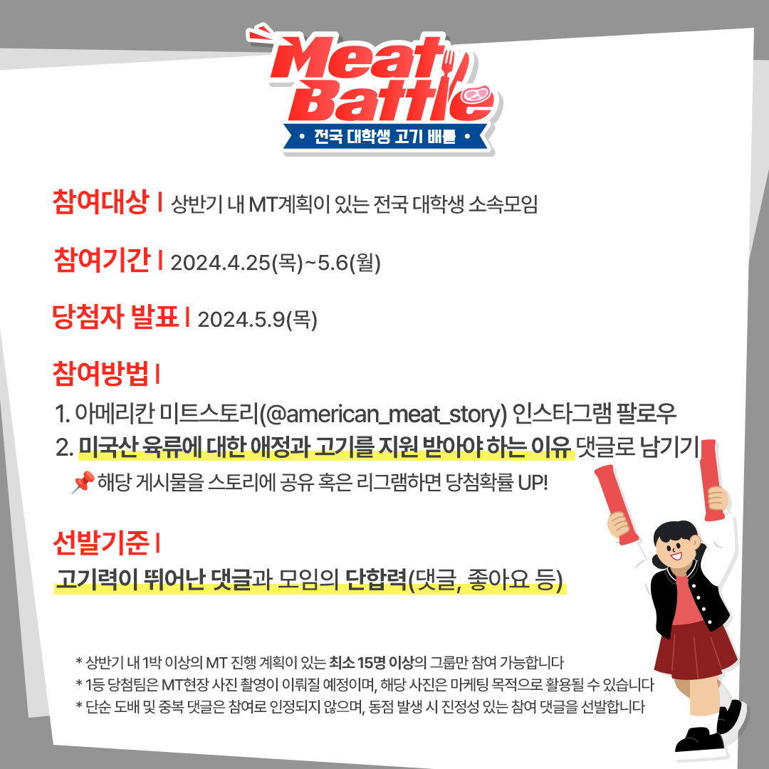 ✌️위의 링크로 연결되는 미트배틀 이벤트 게시물에 미국산 소고기와 돼지고기에 대한 애정을 담아, 왜 우리 학과(동아리)가 고기를 받아야 하는지 사연 남기기