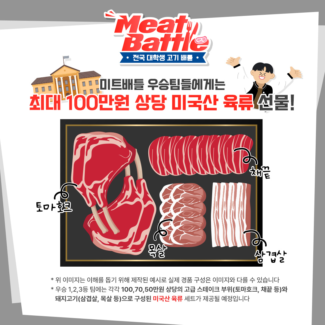 우승 팀들에게는 토마호크, 채끝 등 고급 부위와 삼겹살, 목살 등으로 구성된 최대 100만원 상당의 미국산 소고기와 돼지고기가 지원된다고 하니 놓칠 수 없는 기회죠?