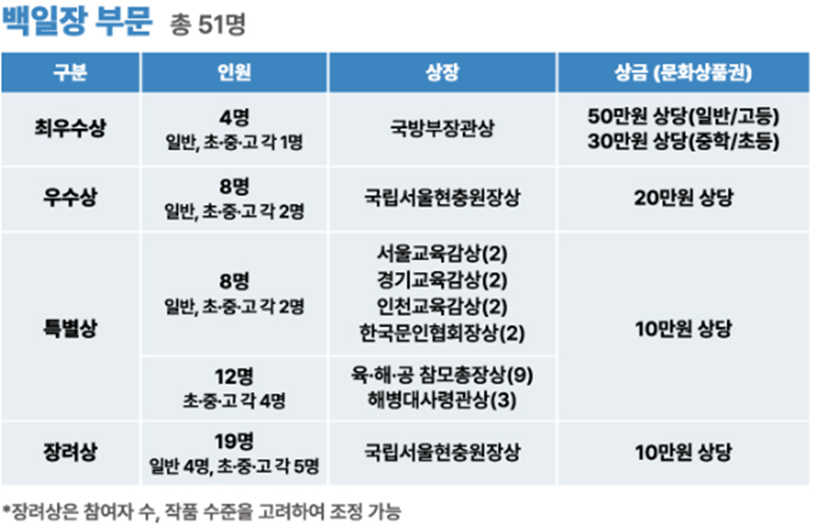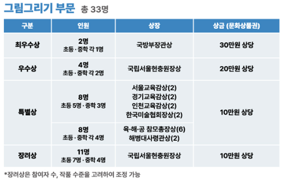 국방부 장관상, 국립서울현충원장상, 서울·경기·인천교육감상, 육·해·공 참모총장상 등 시상