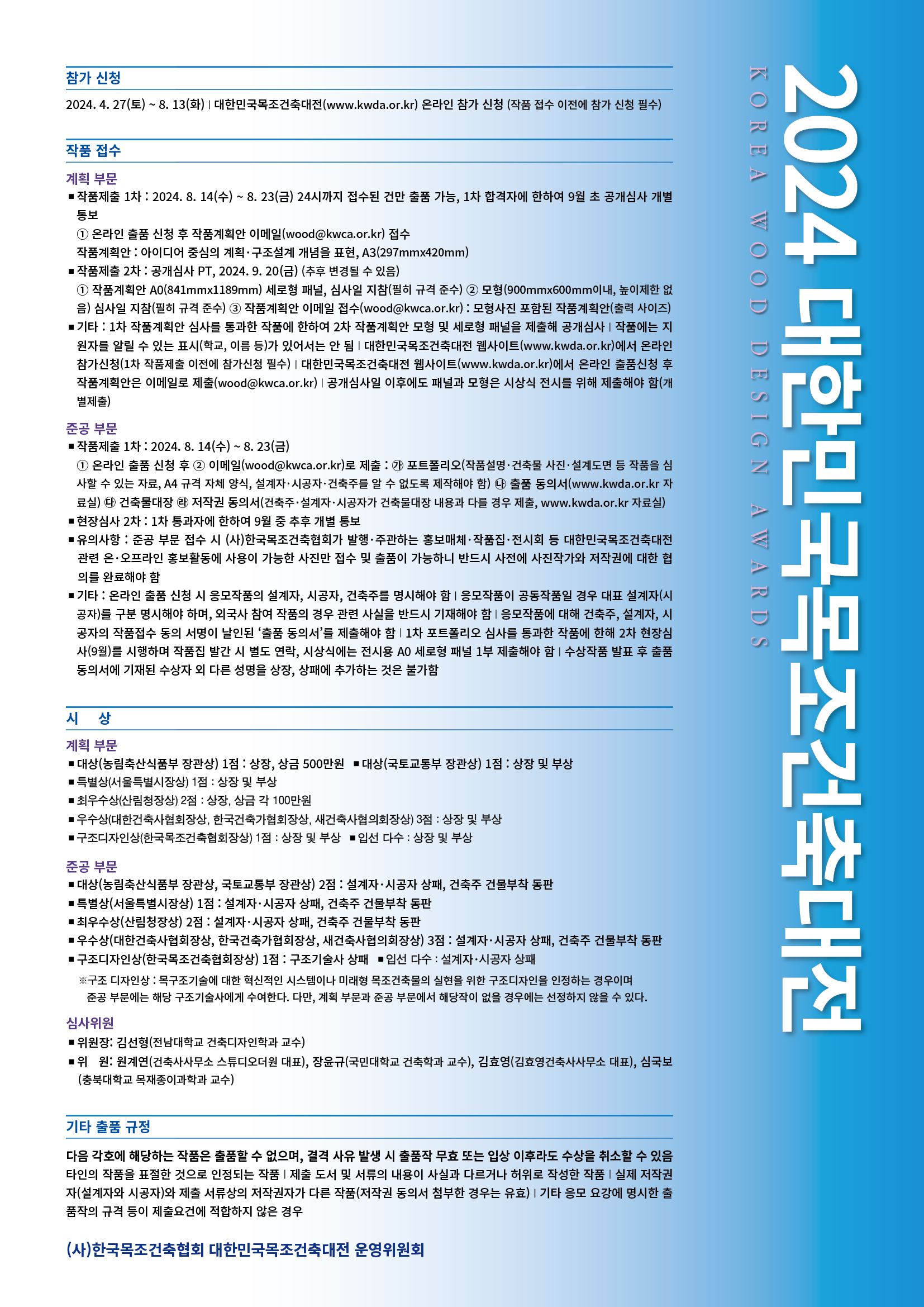 ※구조 디자인상 : 목구조기술에 대한 혁신적인 시스템이나 미래형 목조건축물의 실현을 위한 구조디자인을 인정하는 경우이며 준공 부문에는 해당 구조기술사에게 수여한다. 다만, 계획 부문과 준공 부문에서 해당작이 없을 경우에는 선정하지 않을 수 있다.