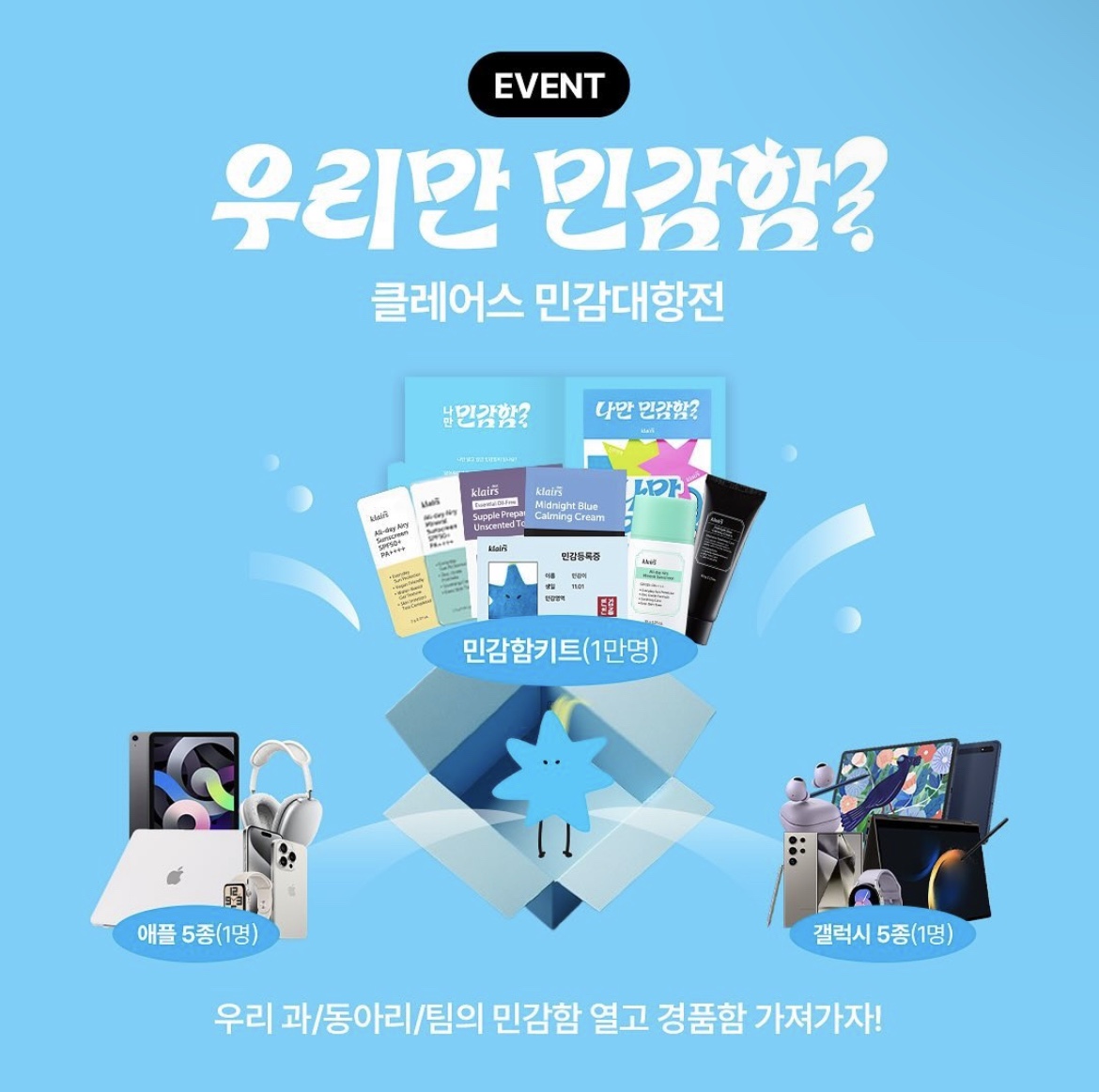 추첨을 통해 민감함 키트(클레어스 샘플 키트)를 포함, 빅 경품 (애플 5종,갤럭시 5종) 증정!