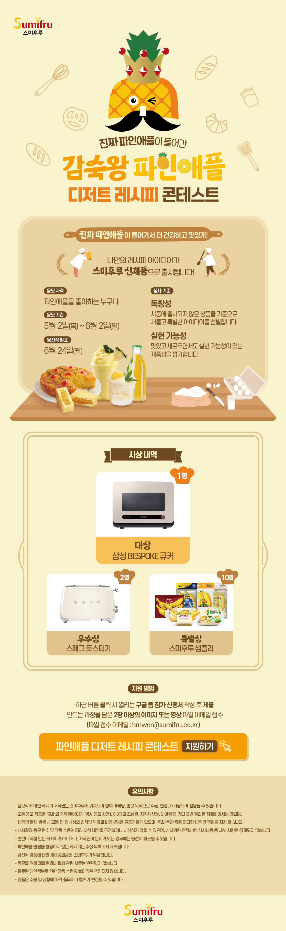 - 파인애플 콘테스트를 통해 응모된 모든 레시피와 아이디어는 스미후루 내 담당자들에 의해 심사가 이루어집니다.