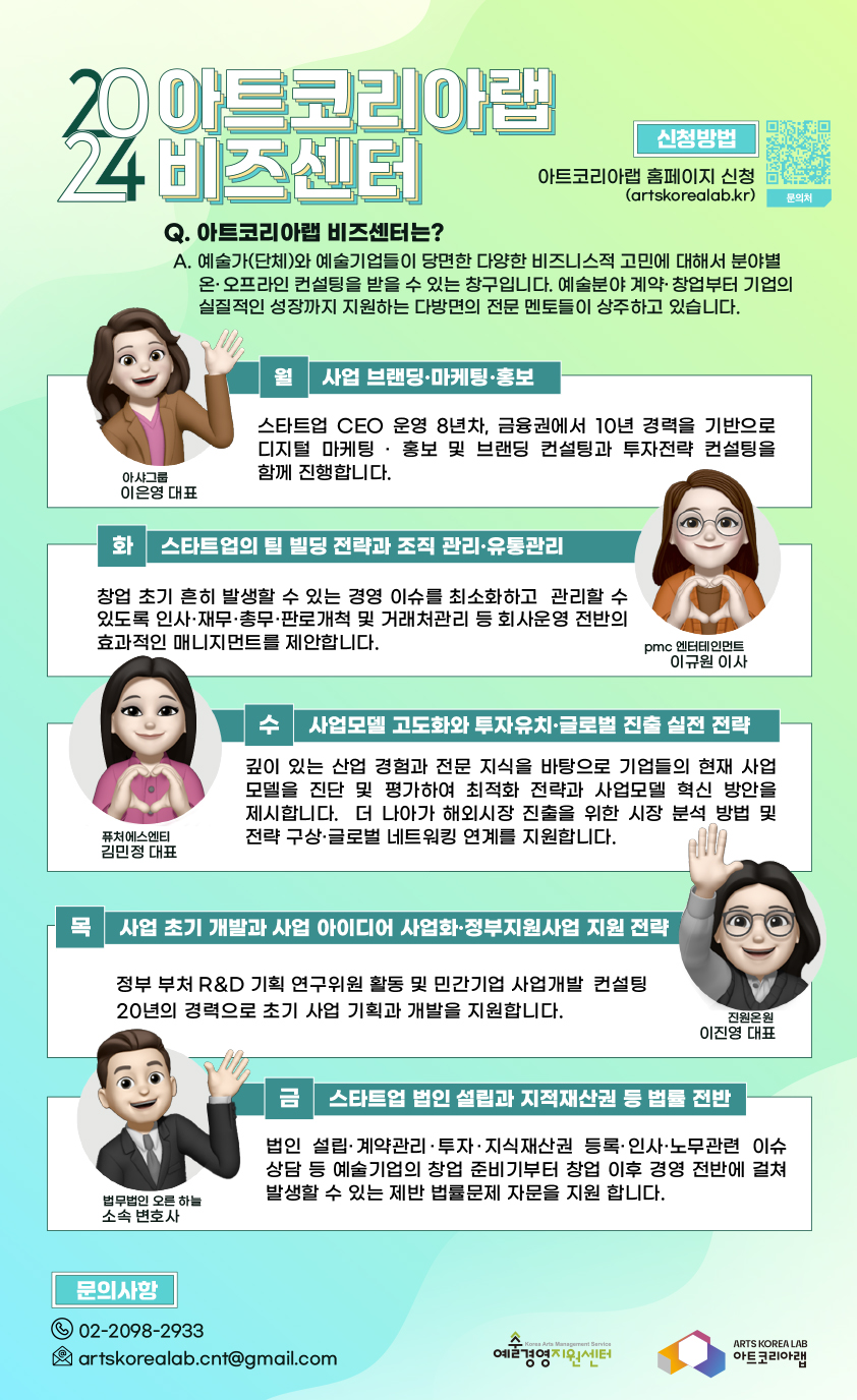 아트코리아랩 비즈센터에서는 예술 분야 창업 기업의 실질적인 성장 지원을 위한 다방면의 전문 멘토들이수시로 비즈센터에 상주하고 계시며 오프라인으로 방문하여 대면 또는 온라인 화상회의을 통해 상담받으실 수 있습니다.