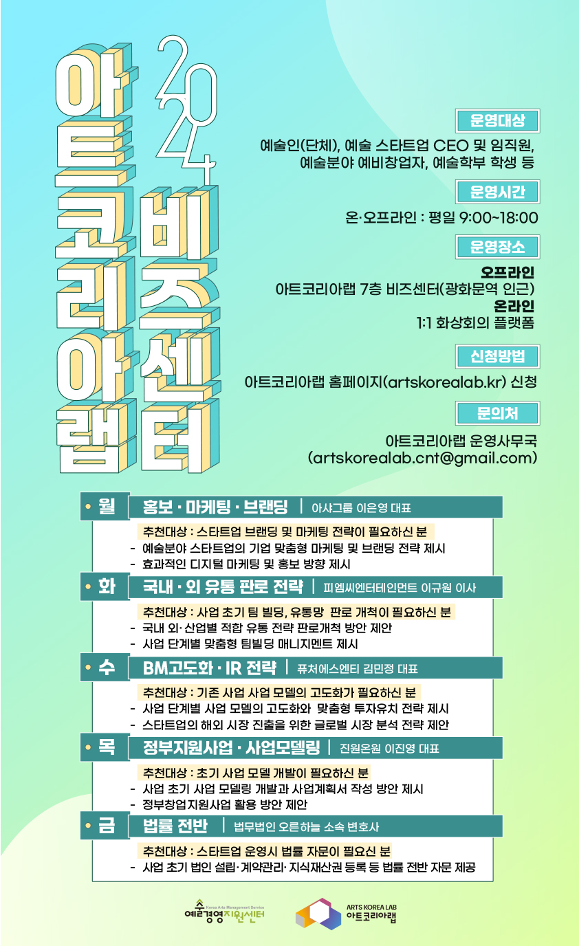 여러 분야에서 활동하고 계시는 많은 예술가(단체)와 예술기업들이 당면한 다양한 비즈니스적 고민에 대해서분야별 전문가들에게 온, 오프라인 상담을 받을 수 있는 창구인 '비즈센터'를 소개합니다.