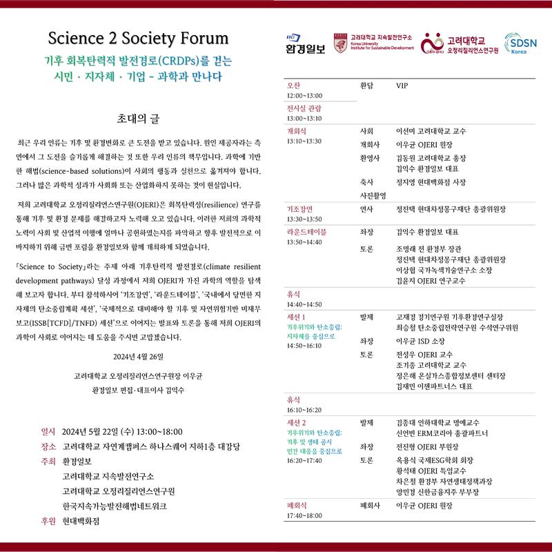 주최 🌲 환경일보, 고려대학교 오정리질리언스연구원, 고려대학교 지속발전연구소