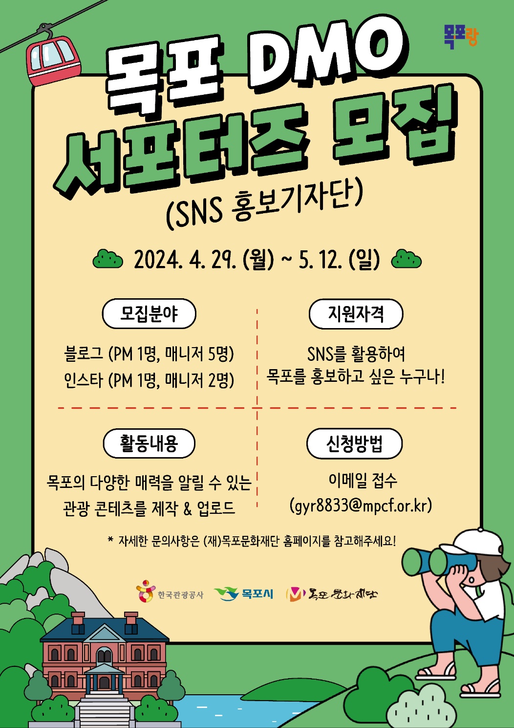 (재)목포문화재단에서 목포시의 관광, 문화, 예술, 축제 등 다양한 소식을 활발하게 홍보할 「목포DMO 서포터즈」를 모집합니다.