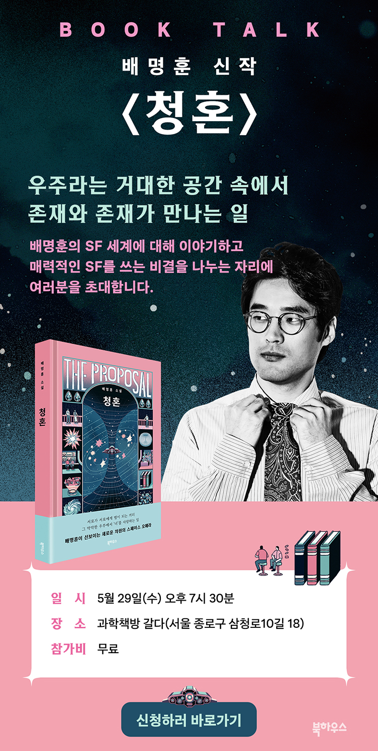 11년 만에 독자들에게 돌아온 『청혼』은 천체물리학, 군사학 등 배명훈 작가가 꾸준히 탐독해온 지식들이 이야기를 탄탄하게 받쳐주어 우주라는 공간과 그곳에서 벌어지는 사건들이 더욱 구체적이고 현실감 있게 살아납니다.