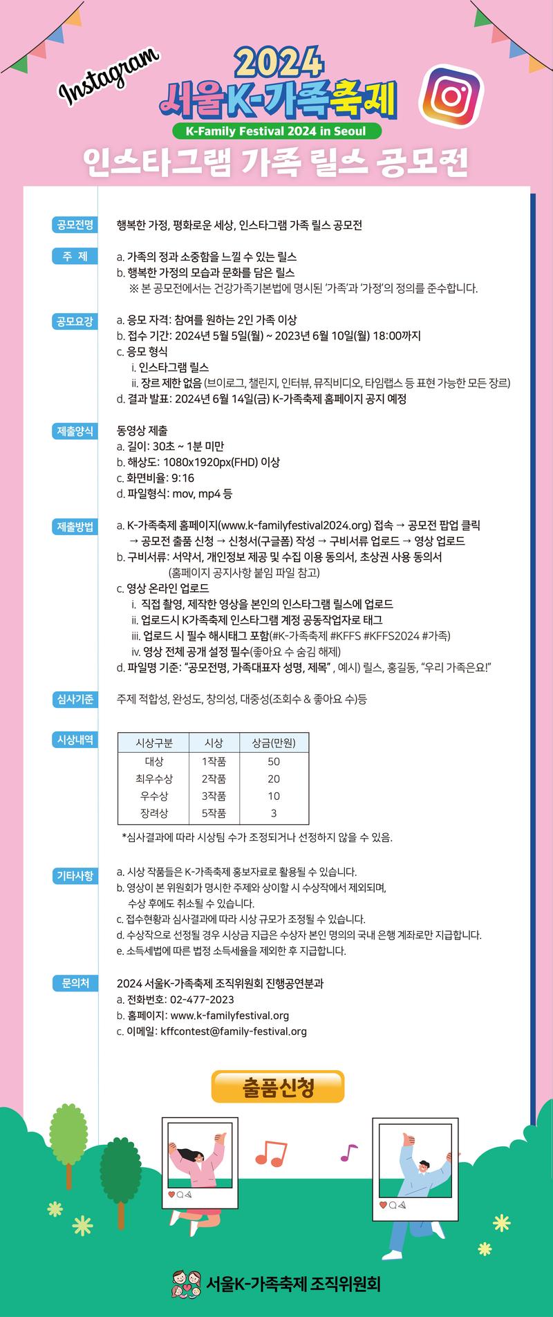-결과 발표: 2024년 6월 14일(금) 서울K-가족축제 홈페이지 공지 예정