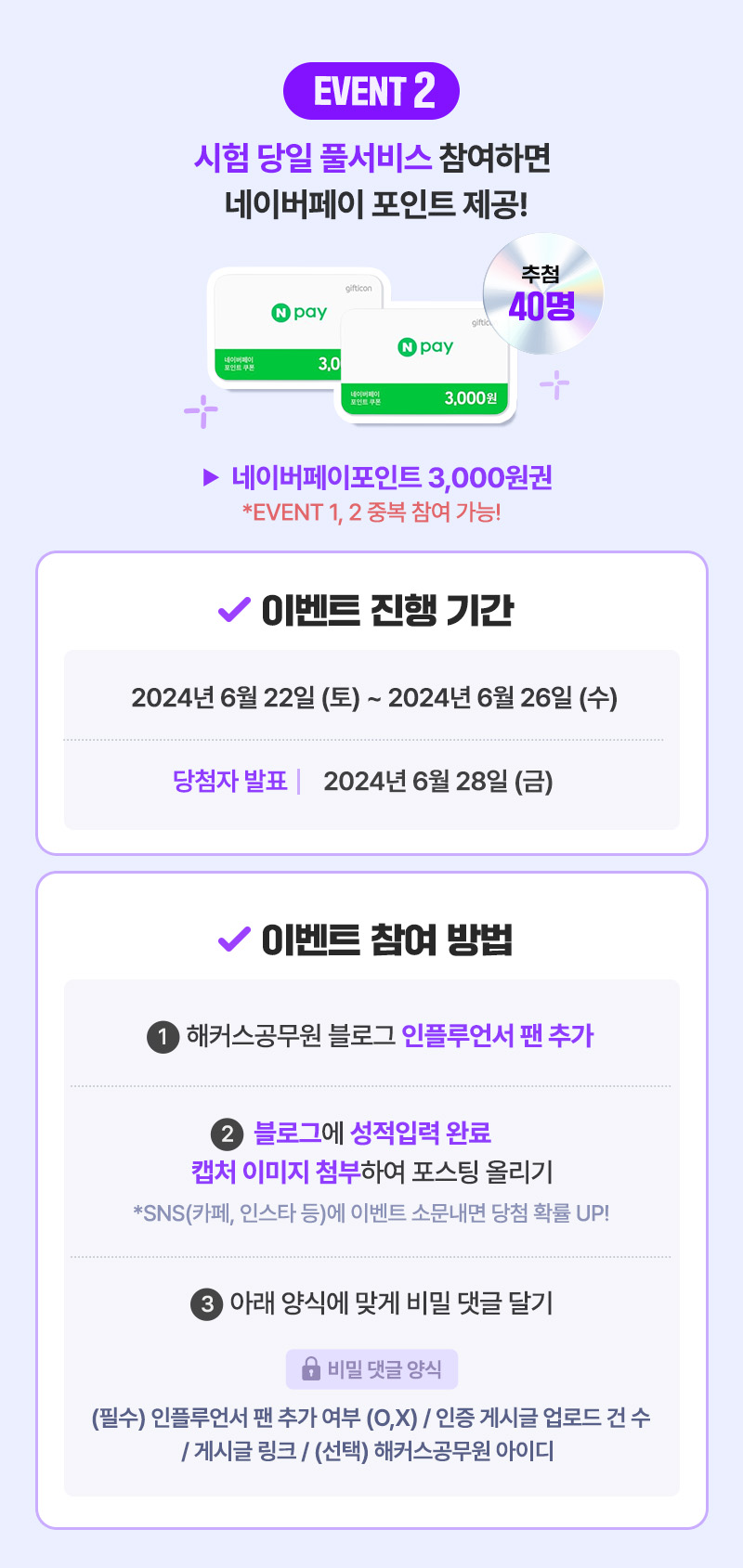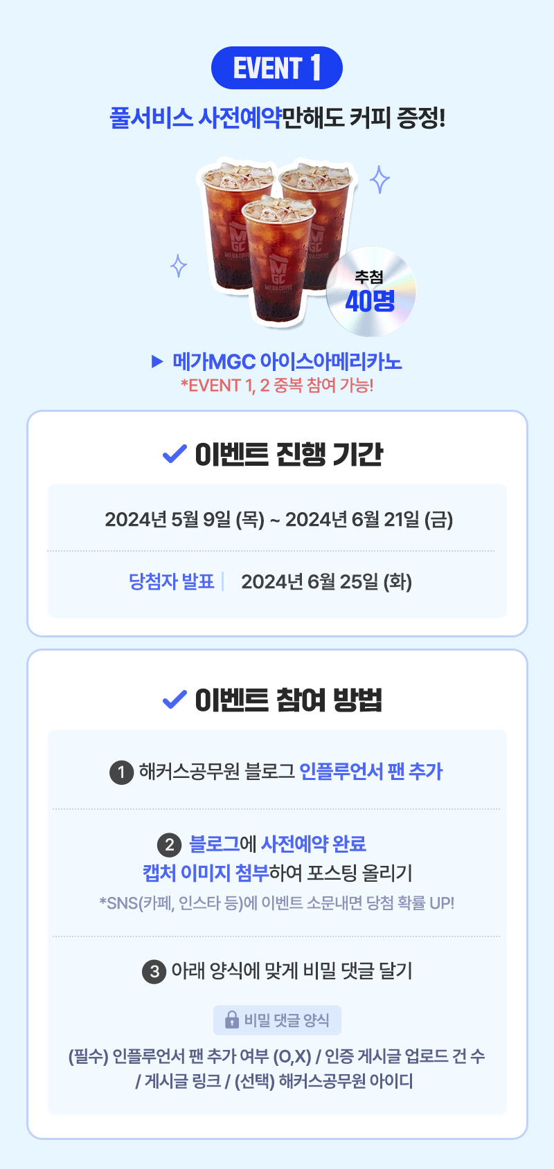 간단한 이벤트 참여하시고 시원한 아이스 아메리카노와 네이버페이 포인트 3,000원권 받아가세요! 자세한 사항은 링크에서 확인 가능합니다 :)