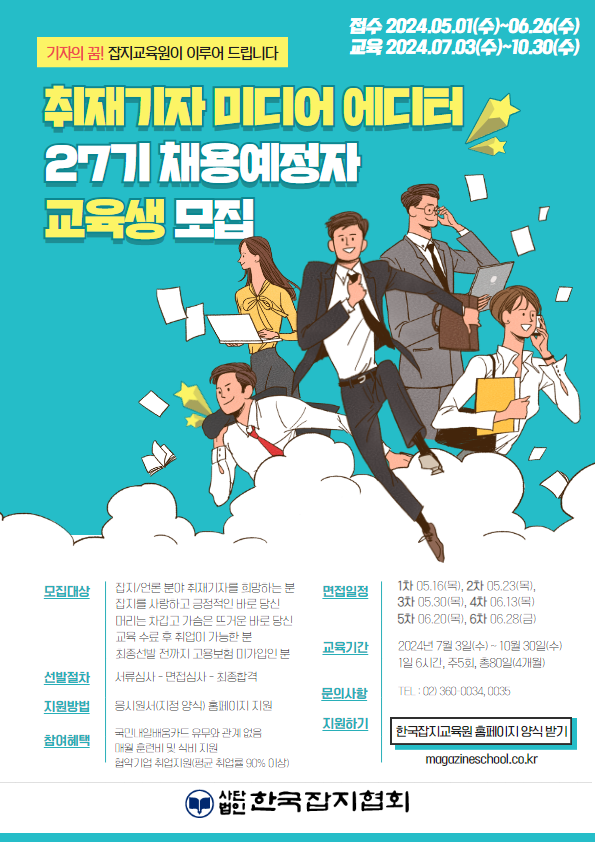 (사)한국잡지협회 부설 한국잡지교육원은 잡지언론분야 전문인력 육성 국가공동훈련센터입니다. 취재기자 신규인력 육성을 위한 전문교육인 "취재기자 미디어 에디터 27기" 채용예정자 훈련을 오는 5월 1일부터 6월 26일까지 모집합니다.