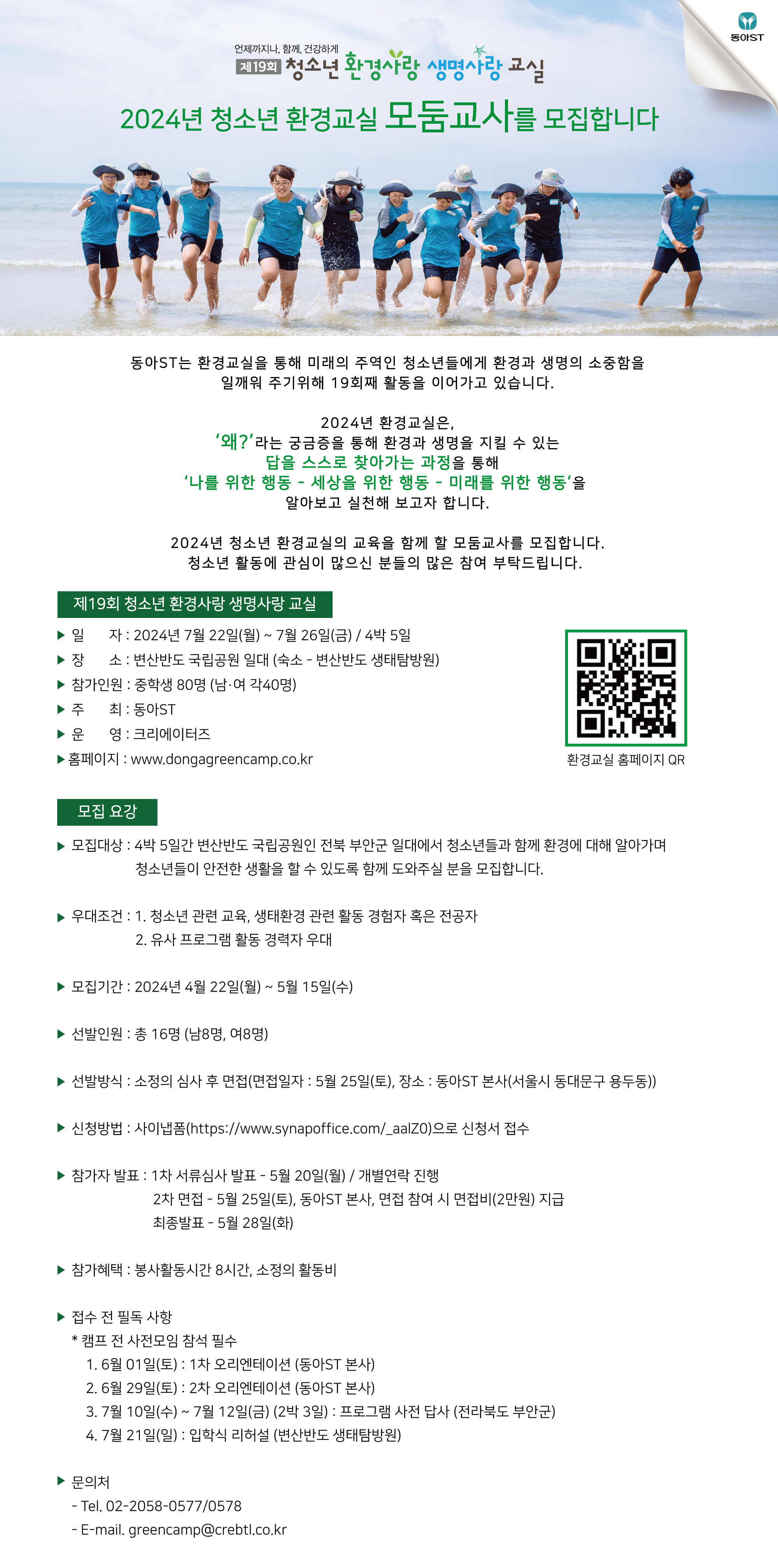 - 홈페이지(dongagreencamp.co.kr) or 사이냅폼(https://www.synapoffice.com/_aalZ0) 지원가능