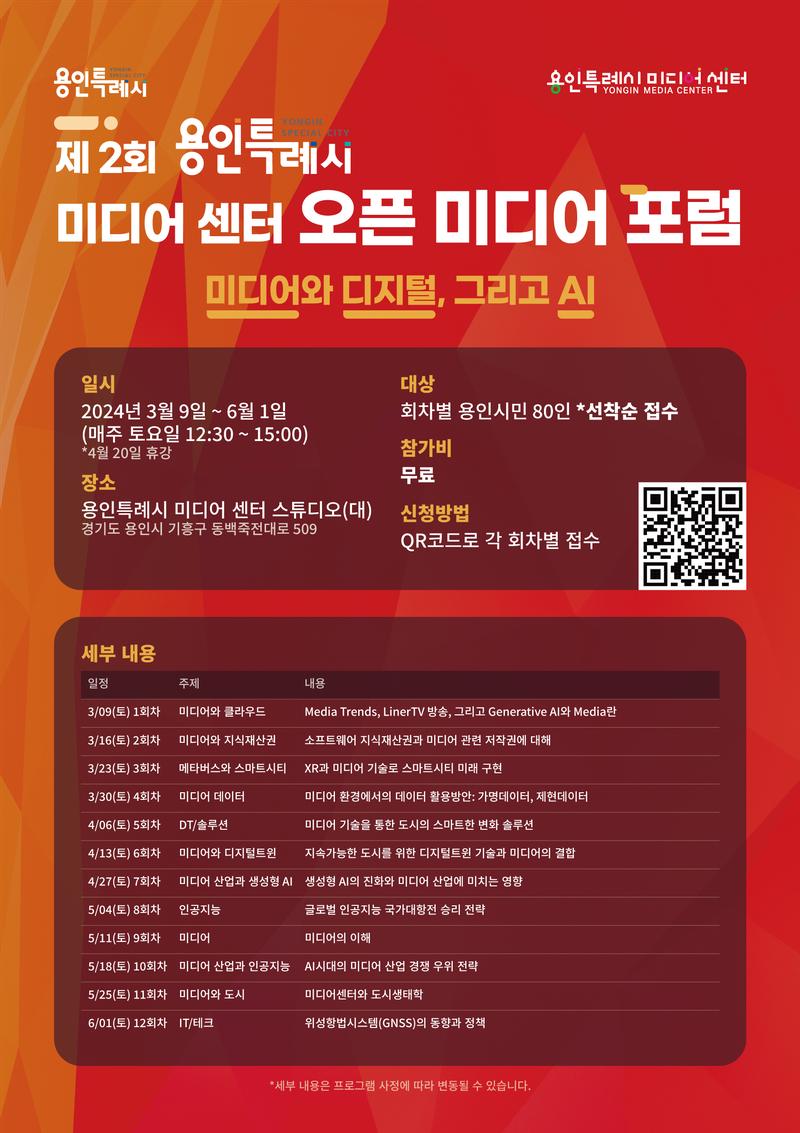 용인특례시 미디어 센터에서 ‘제 2회 미디어 센터 오픈 미디어 포럼’을 개최합니다. ‘미디어와 디지털, 그리고 AI’라는 주제로 12회차로 구성된 포럼에 많은 관심 부탁드립니다. ( °̀ᗝ°́)و.*・゚✧