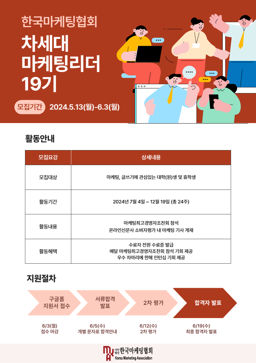 사단법인 한국마케팅협회에서 차세대마케팅리더 19기를 모집합니다.
