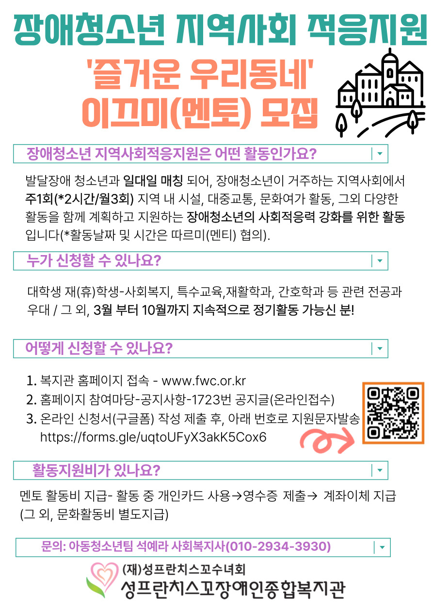 장애청소년 지역사회 적응지원 '즐거운 우리동네' 이끄미(멘토) 봉사자를 모집하오니 많은 관심 부탁드립니다.
