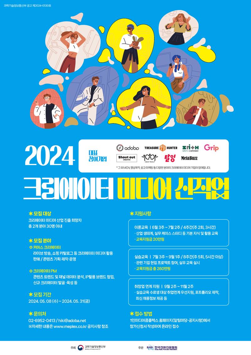 과학기술정보통신부와 한국전파진흥협회가 함께하는 '크리에이터 미디어 신직업 육성 사업'을 통해, 성장하는 미디어 산업군에 맞는 새로운 직업을 육성하고자 합니다