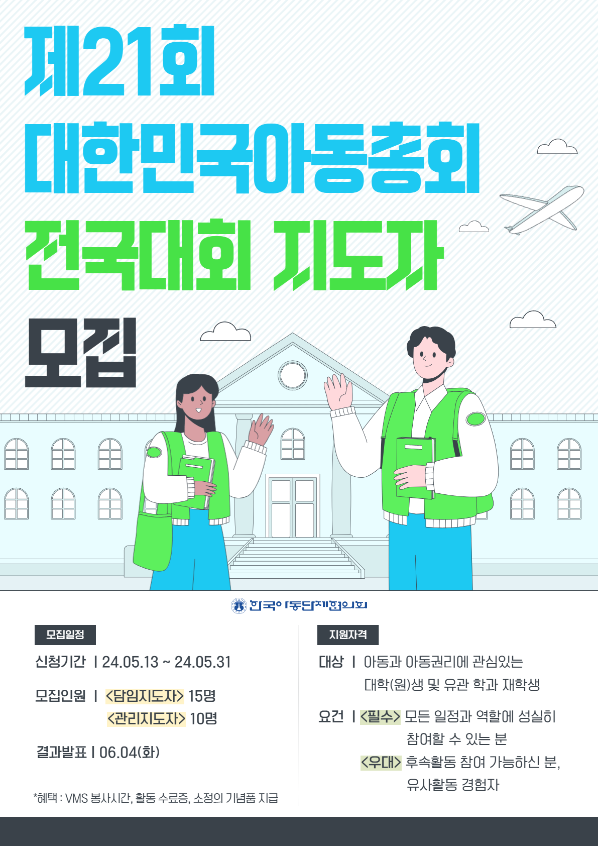 한국아동단체협의회에서 제21회 대한민국아동총회의 담임 지도자 및 관리 지도자를 모집하고자 합니다.