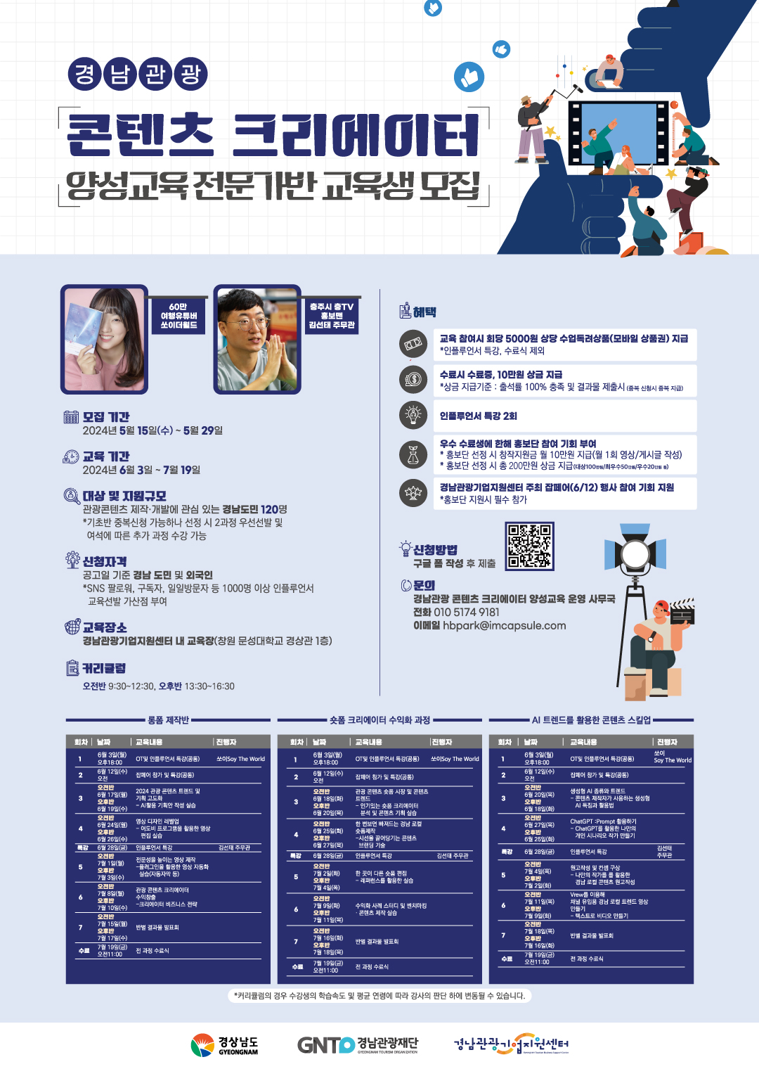 경남 지역 관광콘텐츠 활용 전문가 육성을 위한 「경남 관광 콘텐츠 크리에이터 양성교육」참가자를 모집합니다.